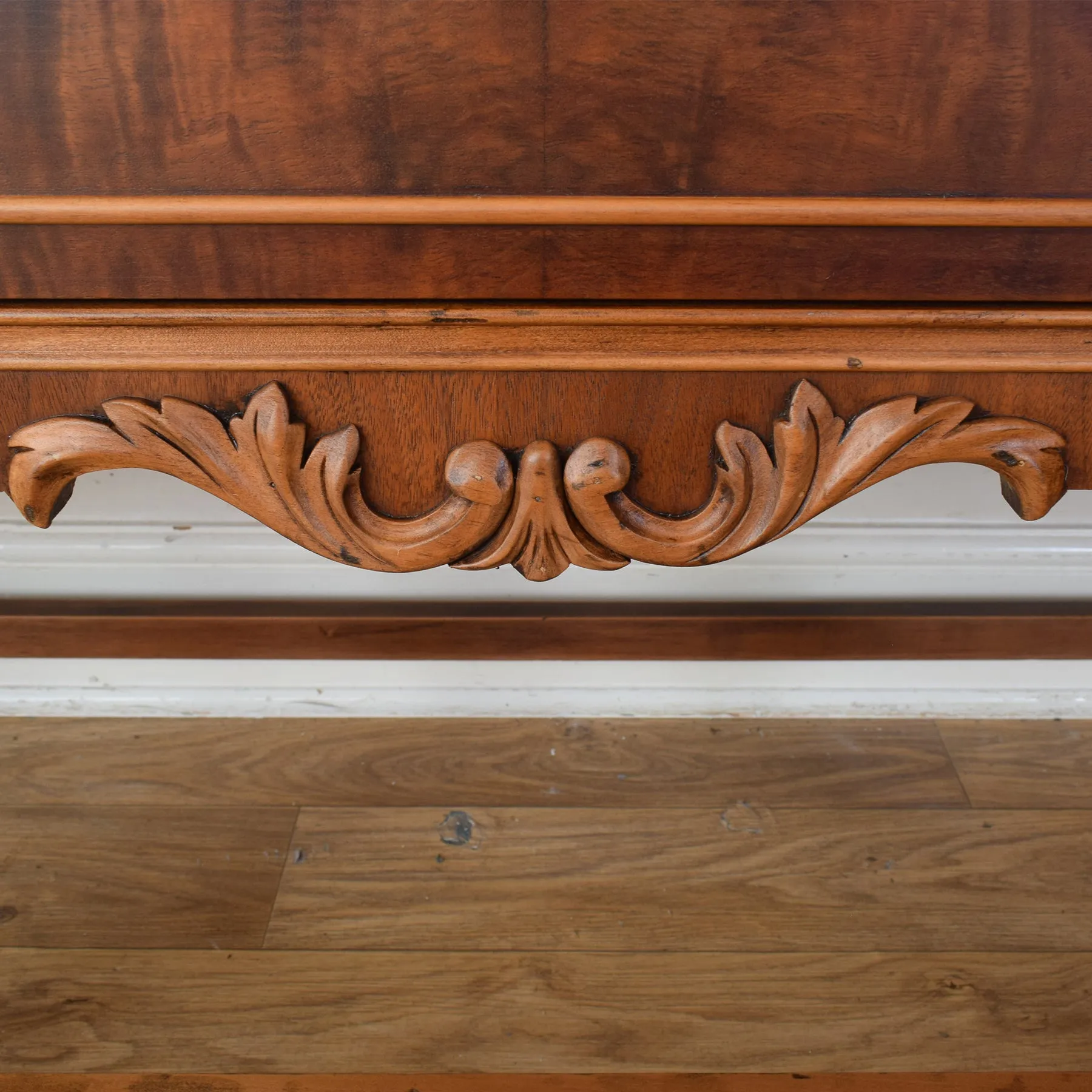 The original finish has been stripped back and refinished with multiple coats of durable lacquer, enhancing the natural grain and depth of the mahogany. A white marble worktop, vessel basin and brass taps complete the piece, creating a refined contrast between traditional furniture and contemporary bathroom design.